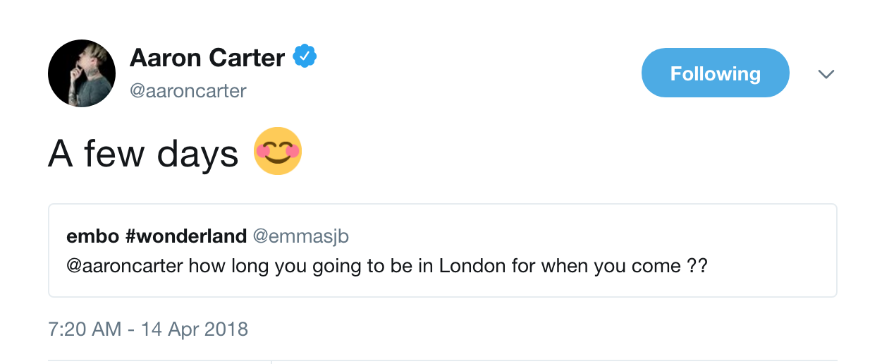 When asked how long he will be in the UK for the show, he tweeted back: